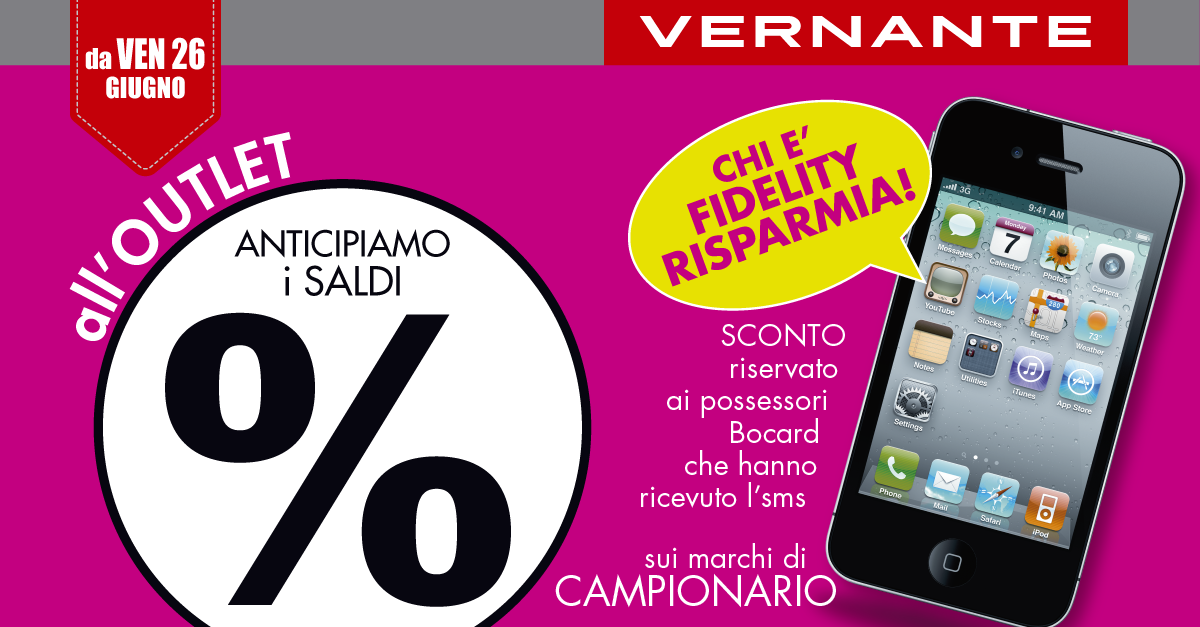 All’Outlet di Vernante, da venerdì 26 giugno, ANTICIPIAMO I SALDI! L’offerta è riservata a tutti i possessori della BoCard che hanno ricevuto l’sms e si applica ai marchi di CAMPIONARIO.